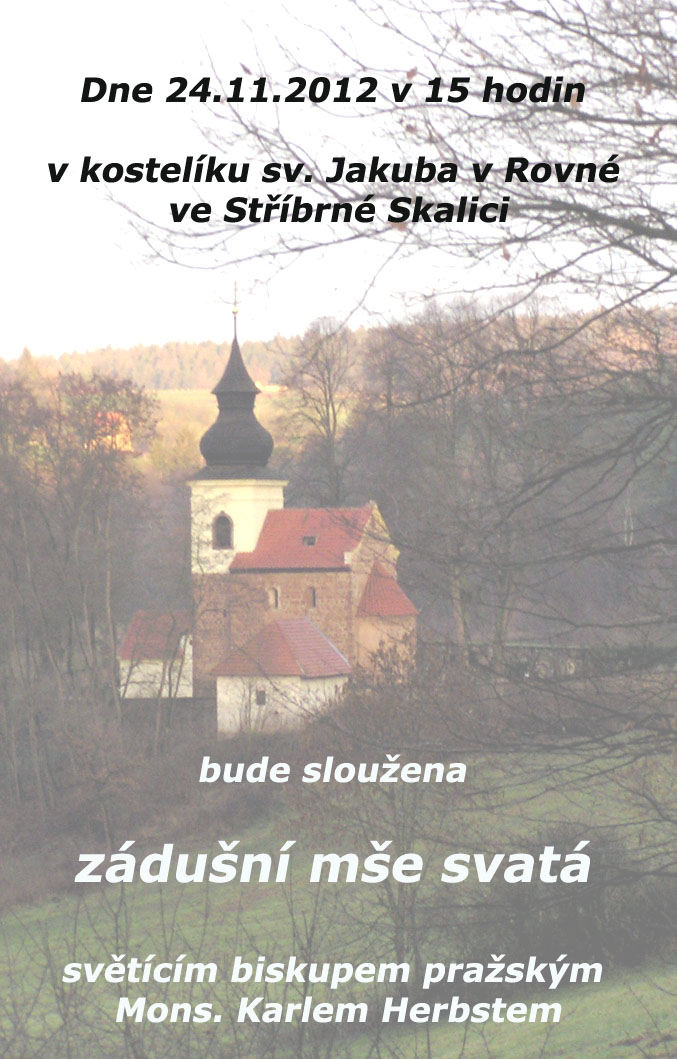 14.11.2012 21:03Letošní zádušní mše svatá v kostele sv. Jakuba, kterou bude celebrovat světící biskup pražský Mons. Karel Herbst bude završením letošních událostí, kterých jsme byli svědky v kostele sv. Jakuba v Rovné. Účast biskupa Mons. Herbsta je také oceněním práce těch, kteří finančně či organizačně pomohli realizovat restaurování varhan, obohatit interier o nové lavice a návštěvníky koncertů o hezké kulturní zážitky.